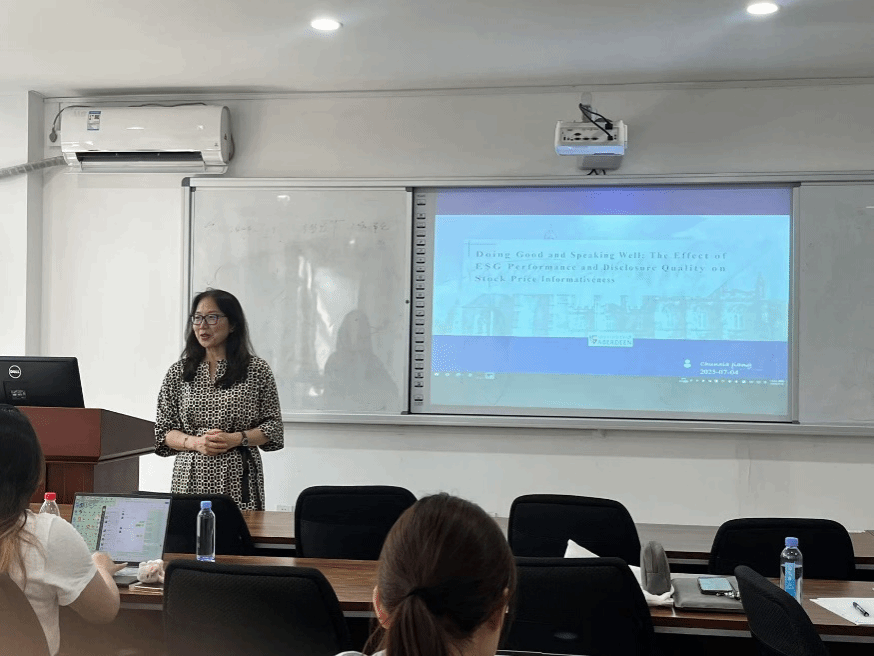 首先,姜老师带来《Doing Good and Speaking Well: The Effect of ESG Performance and Disclosure Quality on Stock Price Informativeness》的主题报告。报告就ESG绩效和披露质量如何在财务和非财务绩效方面影响股价信息含量展开讨论,让我们了解各变量间的内在逻辑关系。报告结束后,姜老师还向我们介绍了在高质量英文期刊发表的一些技巧。