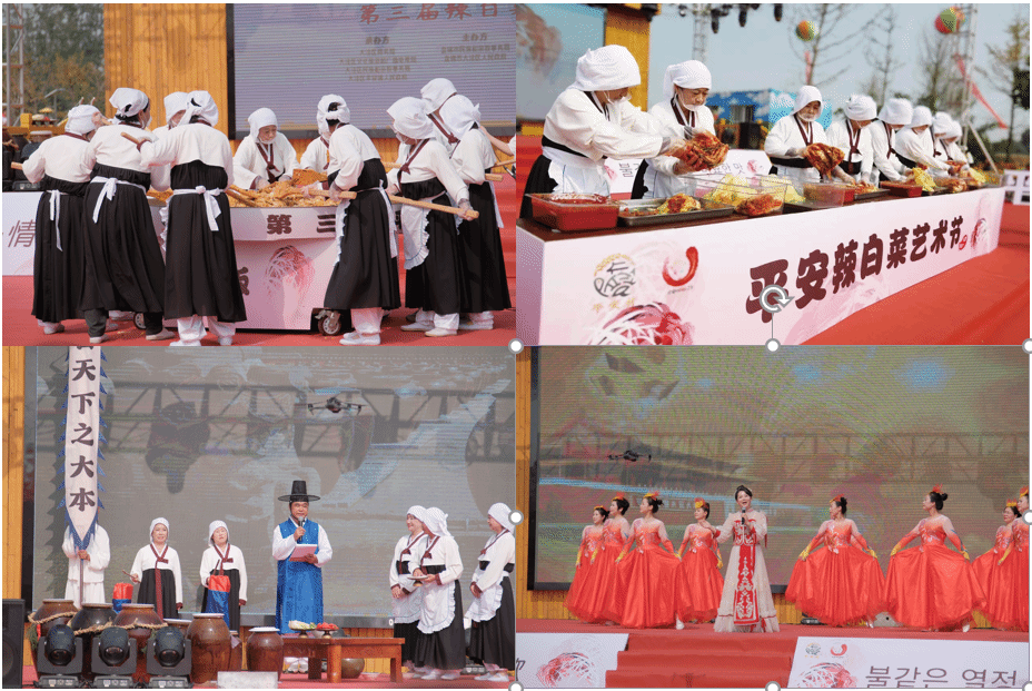 活动现场人流如织,浓郁的朝鲜族风情扑面而来,热闹非凡。本次活动共分为“微素描展览、朝鲜美食、非遗文创、民俗体验、风情演绎”5个板块,具体包含“百人腌制辣白菜、千人拌饭、朝鲜族婚礼秀、歌舞秀、音乐晚会、投壶、射箭”等20余项活动。本次辣白菜艺术节的规模盛大、形式新颖,不仅宣传了平安村朝鲜族文化,让更多的人了解平安村这个休闲乡村、和美乡村,更充分展现了新时代新农村在全面推进乡村振兴方面的成果。