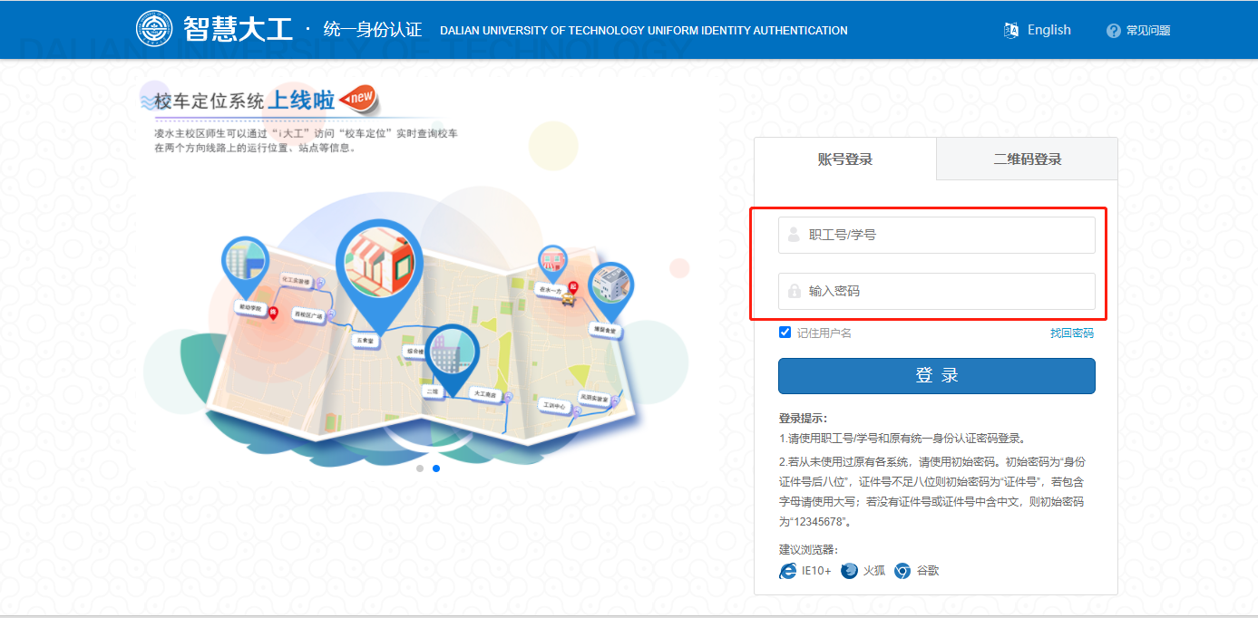 (1)输入网址:https://zzgz.dlut.edu.cn/login#/,进入组织工作一体化平台,选择“统一身份认证登录”,输入学号/教工号及密码;