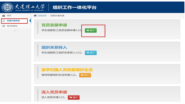 (1)选择“权限开通申请”在党员发展申请一栏中点击“进入”;