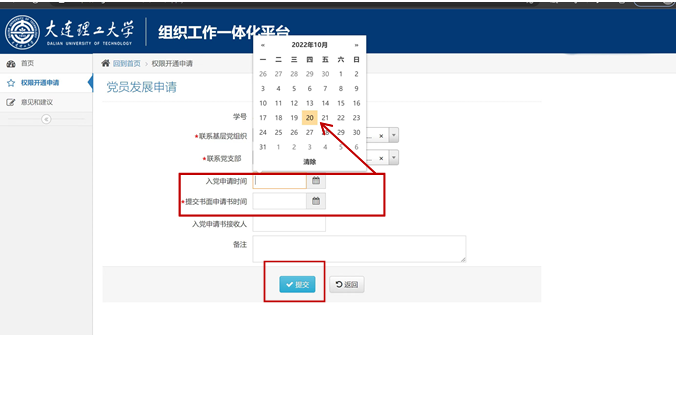 (3)按照实际情况选择“入党申请时间”以及“提交书面申请书时间”的具体日期,确认填写无误后点击“提交”。