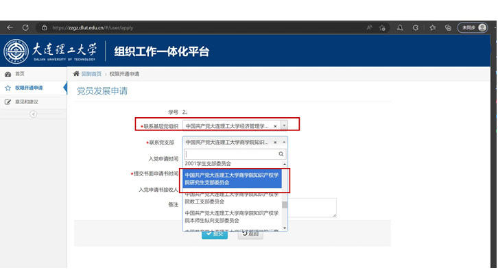 (2)在联系基层党组织中选择“中国共产党天游ty8线路1线路2检测中心入口经济管理学院委员会”,联系党支部中选择本人所属党支部(本科生选择“中国共产党天游线路测速登录中心知识产权学院本师生纵向支部委员会”;研究生选择“中国共产党天游线路测速登录中心知识产权学院研究生支部委员会”;教工选择“中国共产党天游线路测速登录中心知识产权学院教工支部委员会”)