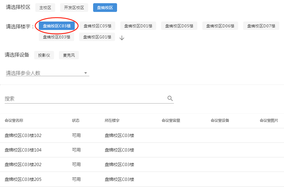 2、在会议室预约界面找到楼宇信息中的盘锦校区-C03(如下图所示), 然后根据计划预约的日期、时段、以及具体会议室进行选择,最后点击界面下方的预约,并等待关注审核结果即可。“i 大工”App 客户端登录后,同样可以在“办事大厅”模块中按照如上流程进行会议室预约。