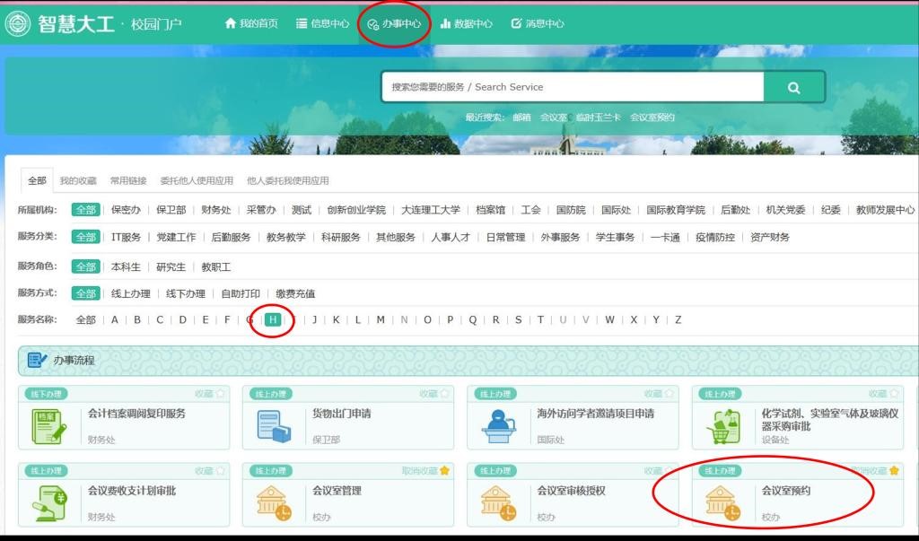 1、登录学校校园门户,找到办事中心的会议室预约模块并点击进入。(如下图所示)