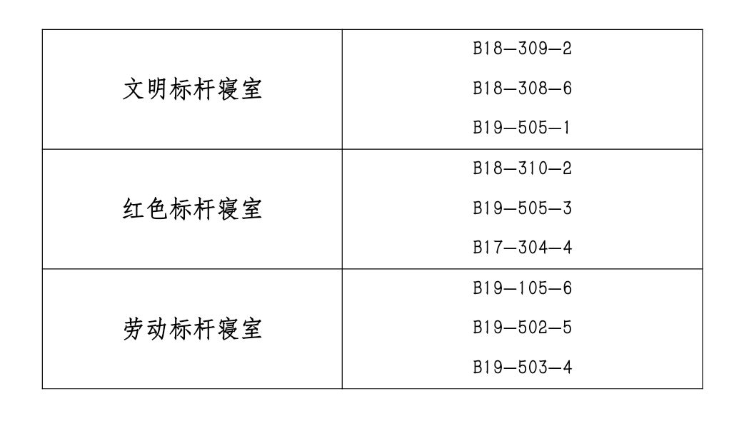 在初赛评选过程中,依据各寝室所提交材料,共评选出文明标杆寝室、红色标杆寝室、劳动标杆寝室各3个晋级决赛,现将此次初赛结果公示如下: