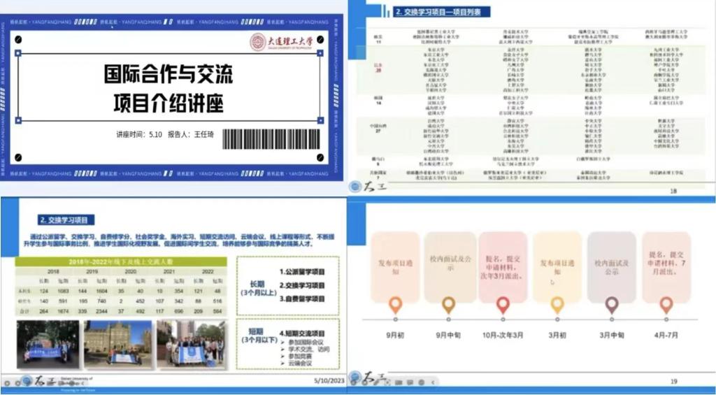 校内老师之声,介绍留学项目。学校国际合作与交流处国际交流科项目主管王任琦老师从公派留学项目、交换学习项目、短期交流访问项目、自费修学分项目、社会奖学金项目、海外实习项目、联合培养类项目以及其他项目八个方面为同学们全面系统介绍学校提供的学生海外交流项目。王任琦老师叮嘱同学们要在求学之路上提前规划,找到努力方向,珍惜时间努力奋斗,让每天都变得有意义。