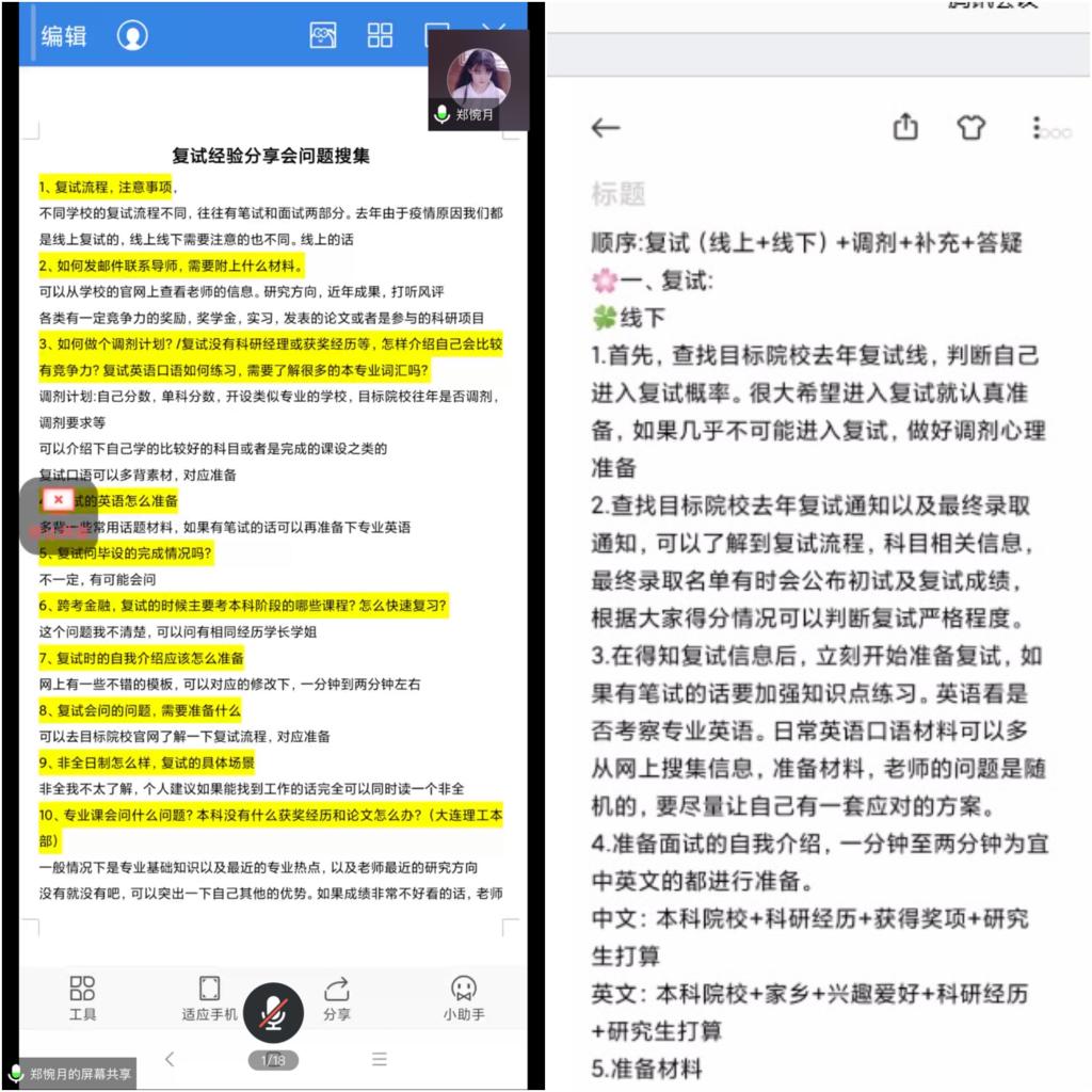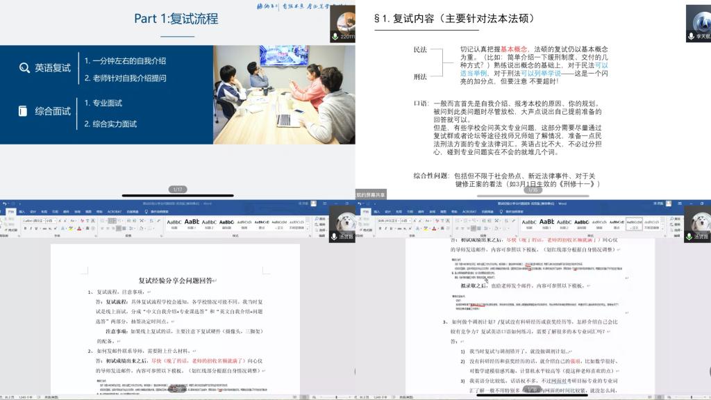 介绍考研复试流程,明确复试所需准备。五位学长学姐分别介绍了考研复试的基本流程,包括英语面试——一分钟自我介绍+面试老师针对自我介绍进行提问、综合面试——专业面试、综合实力面试等。根据考研复试流程,明确参加复试之前所需准备内容。