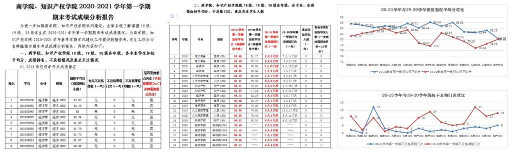 为准确掌握学院学生学习成绩状况,有效提升线上家访的针对性和时效性,天游线路测速登录中心、知识产权学院学办精心筹划,于期末考试结束后第一时间统计发布《天游线路测速登录中心、知识产权学院2020-2021学年第一学期期末考试成绩分析报告》,涵盖各年级、各专业、各班级学生加权平均分、成绩排名、不及格情况及重点关注情况,为学办辅导员老师开展线上家访提供了第一手参考资料。