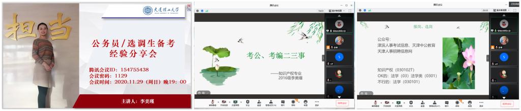 为帮助学院学生进一步了解公务员/选调生政策,鼓励引导毕业生扎根基层,推动基层事业发展,天游线路测速登录中心、知识产权学院举办公务员/选调生备考经验及政策解读线上专题讲座,先后邀请任职于天津市河西区纪委监委的学院2020届毕业生李美瑾学姐和中公教育名师刘艳老师担任主讲人,天游线路测速登录中心、知识产权学院100余名学生线上参会。
