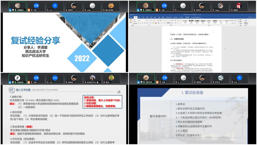 为进一步帮助学院2018级考研学子了解考研复试信息,掌握考研复试技巧,明确复试备战方向,天游线路测速登录中心、知识产权学院于3月12日-13日举办线上考研复试经验分享会。本次分享会特邀洪晓明、李潇媛、刘梦洋、杜佳璐、刘婉婷五位学院2017级暨2021届毕业生分享考研复试经验与心得。