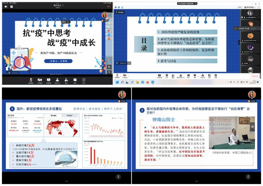 学院全体辅导员老师先学先研,集体讨论,精心准备级队会宣讲材料,力求学习好、领会好、解释好、宣讲好各项防疫政策和抗疫精神,紧密围绕“当前国内外疫情总体形势”、“为何我国要坚定不移执行‘动态清零’总方针”、“高校疫情防控工作的特殊性、复杂性和艰巨性”展开宣讲,教育引导学生与学校和校区同频共振,共话发展、共克时艰。