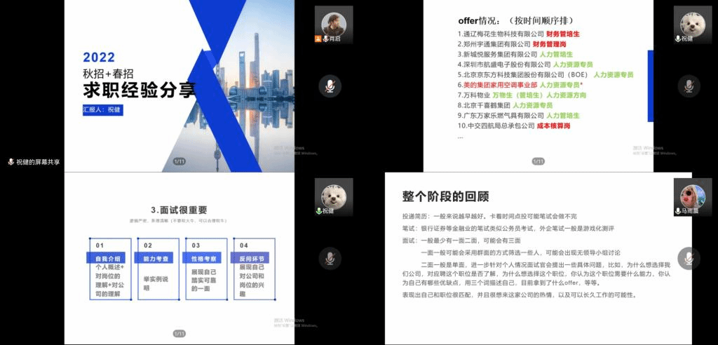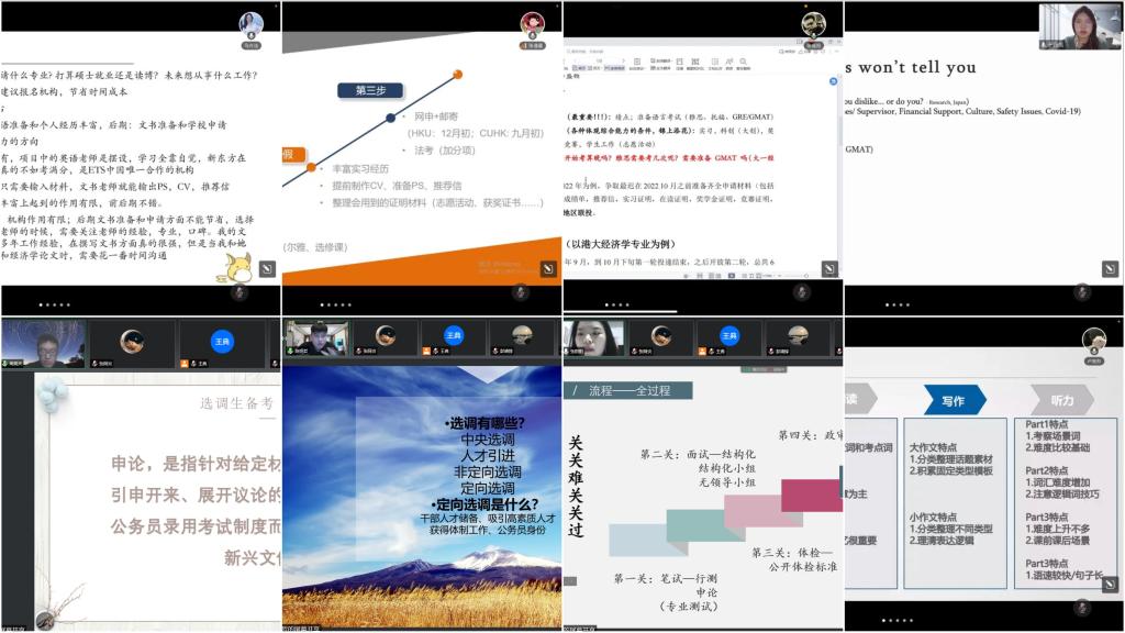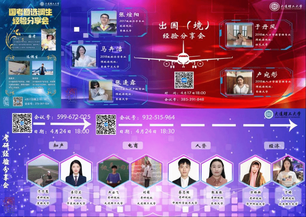 为进一步贯彻落实学校“就业促进月”相关工作安排,充分发挥学院优秀毕业生榜样引领作用,帮助商知学子更加明确未来发展方向,合理制定发展规划,天游线路测速登录中心、知识产权学院于2022年4月先后举办就业、留学、公考和考研四场经验分享会,累计邀请15位毕业生同学分享经验,答疑解惑。