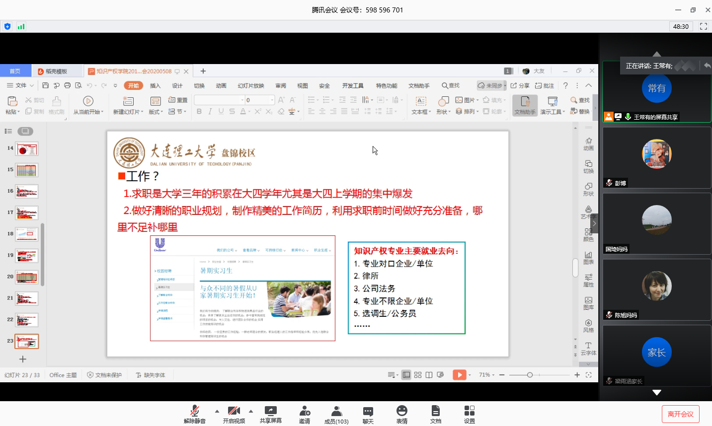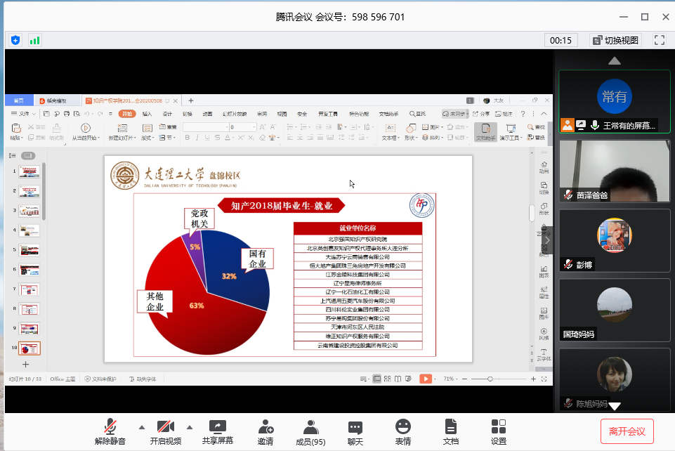 疫情防控期间,习近平总书记先后多次针对高校毕业生就业作出重要指示,“要注重高校毕业生就业工作,统筹做好毕业、招聘、考录等相关工作,让他们顺利毕业、尽早毕业”、“要抓好重点行业、重点人群就业工作,要把高校毕业生就业作为重中之重”。就业工作不仅是每位学生的大事,也是每个家庭的大事。为进一步深化家校合作,帮助学生家长了解专业就业现状,凝聚家校就业工作合力,天游线路测速登录中心、知识产权学院于5月8日晚19:00借助腾讯会议平台举办知识产权专业2017级、2018级“云”家长会暨就业工作推进会,天游线路测速登录中心、知识产权学院学办主任王常有老师担任主讲人,知识产权专业2017、2018级百余名学生家长参与本次“云”家长会。